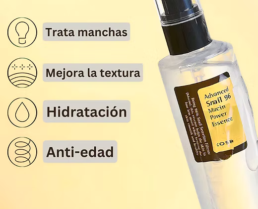 Esta esencia combina una alta concentración de mucina de caracol (96 %) con ingredientes hidratantes y reparadores ligeros para ofrecer un tratamiento que nutre profundamente, mejora la textura y aporta luminosidad sin sensación grasa. Su consistencia gelatinosa-acuosa se absorbe relativamente rápido dejando una piel flexible, suave y visiblemente más saludable. Es ideal para todo tipo de piel, pero se destaca en pieles secas, sensibles, con marcas de acné o tono apagado, gracias a su poder regenerador, calmante y reparador.