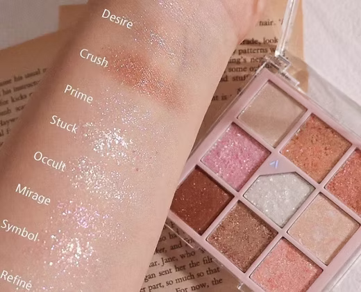 Glitterpedia es vegana y libre de crueldad. Contiene 9 hermosas sombras con suave textura y diferentes colores rosas, beige y marrones.