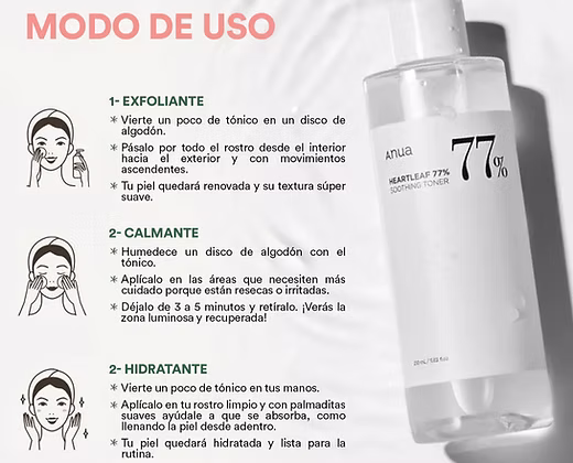 – Extracto Heartleaf (77%): ingrediente central con propiedades antiinflamatorias y antibacterianas que ayuda a calmar la piel irritada y reducir la sensación de incomodidad.
