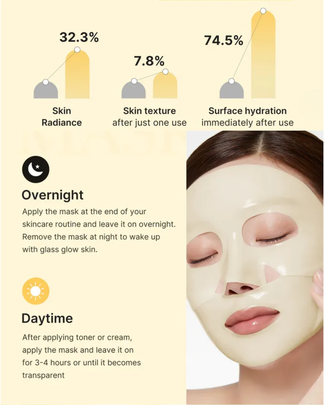 Es una mascarilla facial iluminadora diseñada para reducir manchas, mejorar el tono desigual y aportar luminosidad inmediata a la piel.